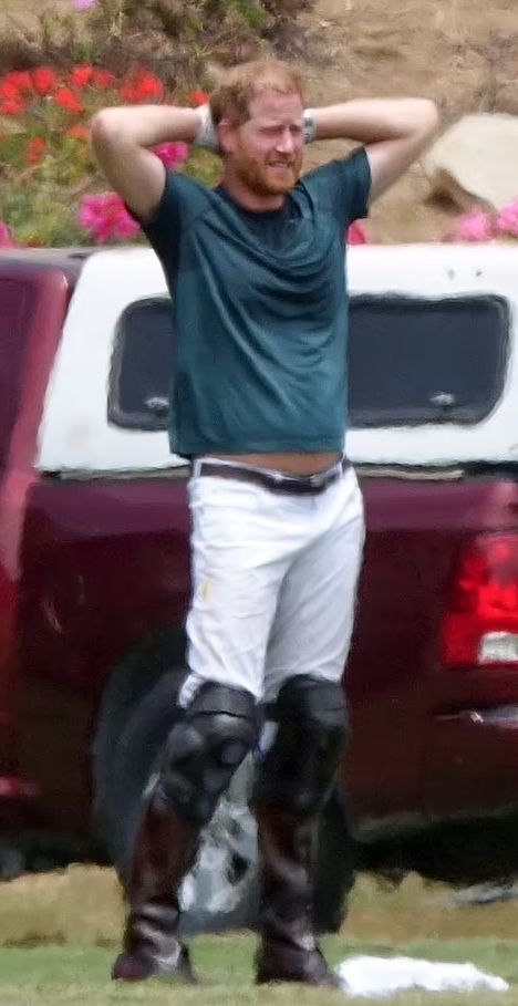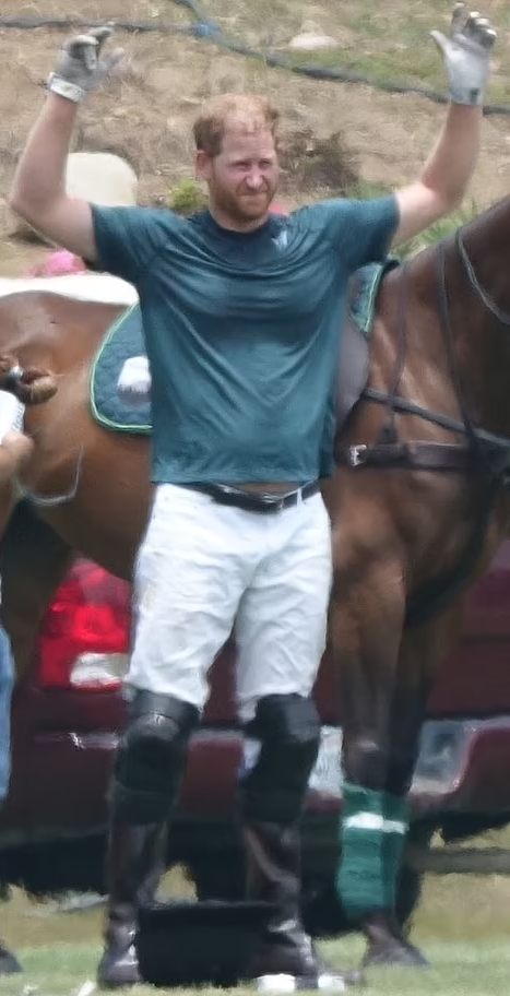 Harry was photographed taking a break, with both of his hands behind his head. Another photo shows him raising his hands with his brown horse behind him.