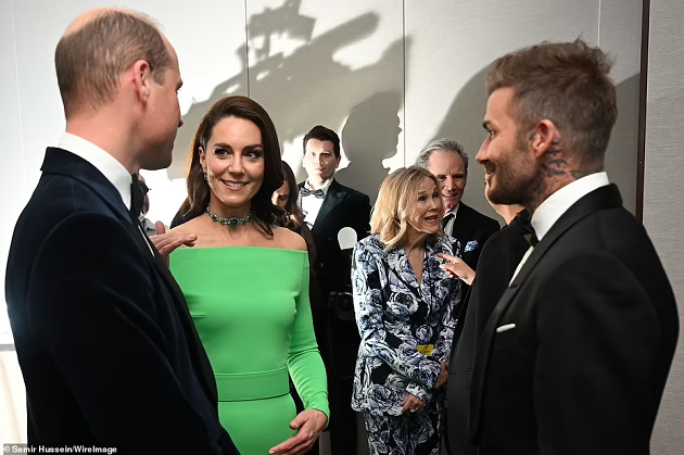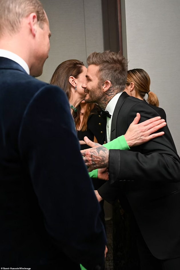 Kate looked thrilled to see her old friend David Beckham as she puckered up for a kiss with the football star, who made a surprise appearance at the star-studded occasion.