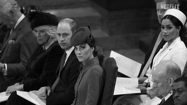 The trailer includes a voiceover from Harry saying: “No one sees what’s happening behind closed doors” as a black and white photo of Meghan crying is shown.