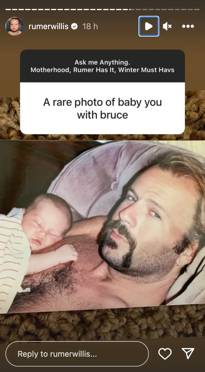 Rumer Willis has shared a heartbreaking photo of herself as a baby with her father Bruce as she and her sisters weighed on whether ‘Die Hard’ is a Christmas film.