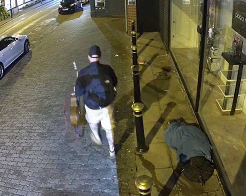 A review of the CCTV footage taken outside the Malvern Link perfume shop where Philip was staying later revealed that an unidentified man wearing a backpack and a hat approached the homeless man while he was fast asleep only to steal his guitar.
