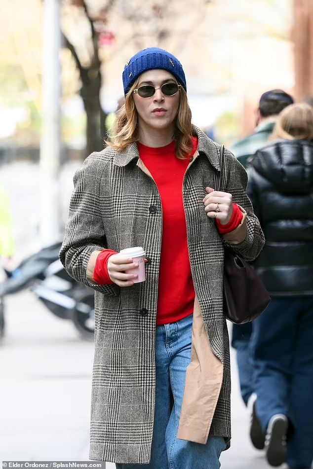 The 13 Reasons Why actress sported a red sweater, blue pants and black boots as she completed her outfit with a duffel coat, chic sunglasses and a beanie.