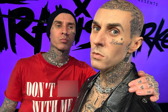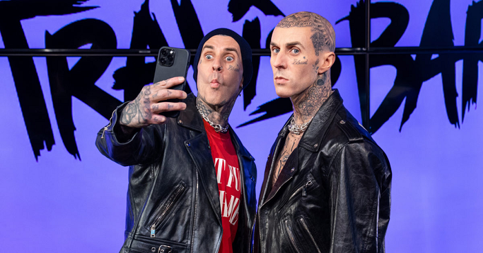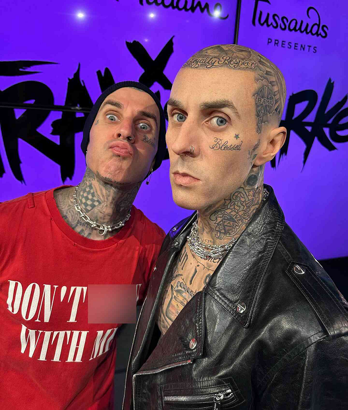 Blink-182 drummer Travis Barker posed with his wax figure and people can’t figure out which one is the real Travis.