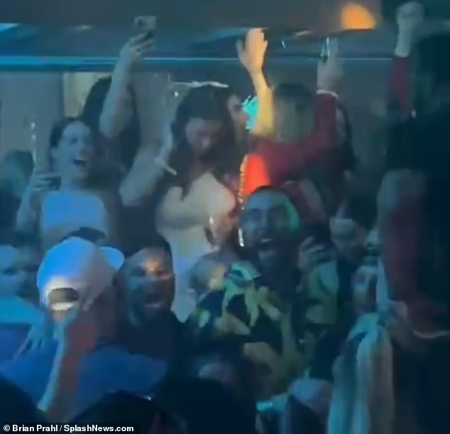 Sporting a Hawaiian style shirt, the 34-year-old reportedly stood on top of a table as they partied for hours.