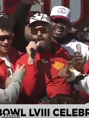 A drunk Travis Kelce had to be carried by his fellow teammates on stage during the Super Bowl parade in Kansas City following their historic win over San Francisco 49ers.