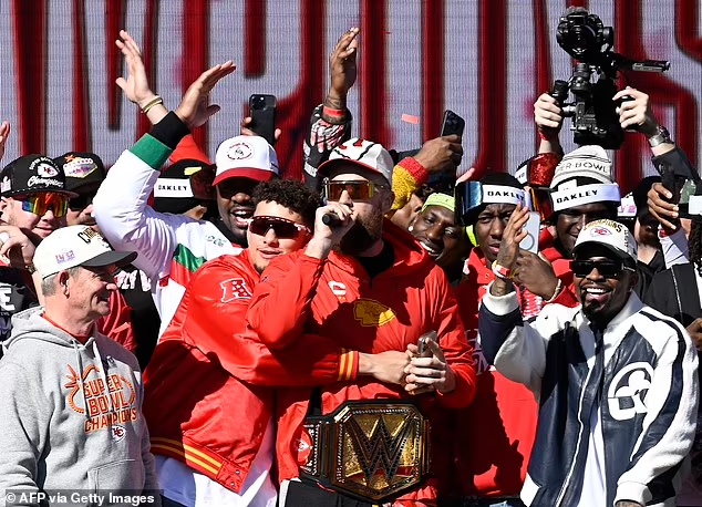 The Chiefs tight end led a drunken rendition of Garth Brooks’ 1990 county hit ‘Friends In Low Places’ after receiving the mic in front of the crowd.