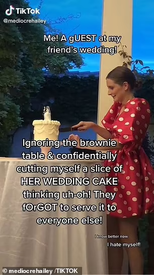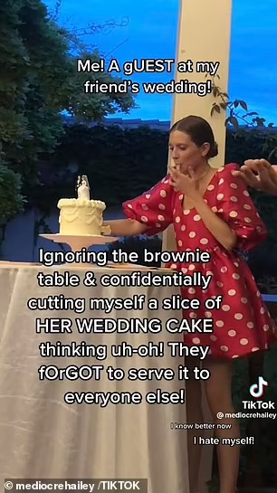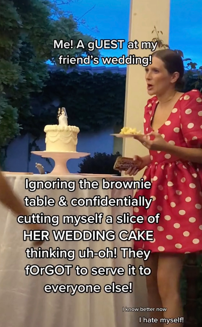Explaining what happened, she wrote: “Ignoring the brownie table and confidently cutting myself a slice of HER WEDDING CAKE thinking, ‘Uh-oh. They forgot to serve it to everyone.’”