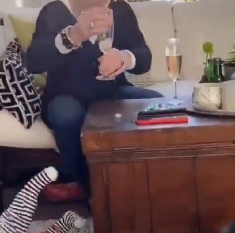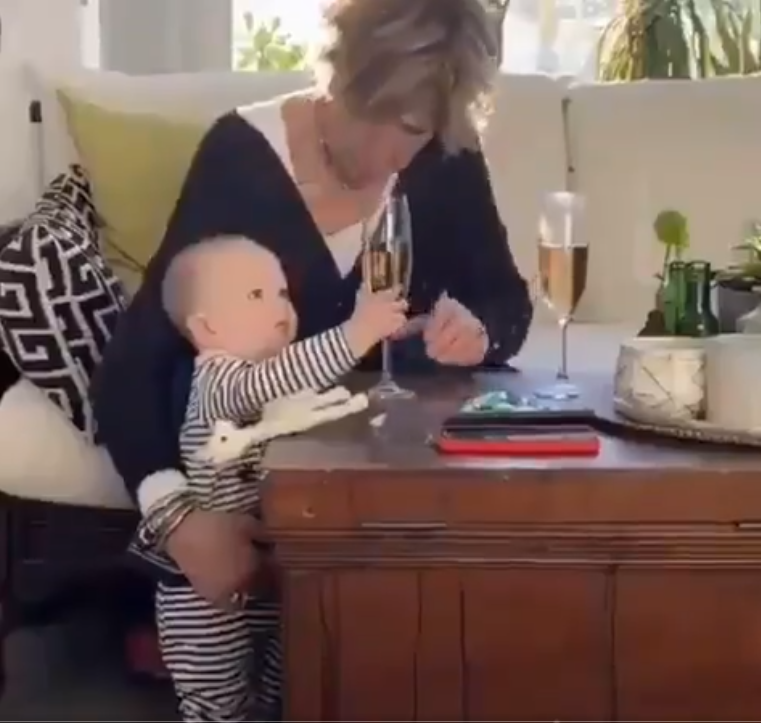 The woman then let go of her hand that was supporting the baby’s back and grabbed the drink, letting the baby getting showered with champagne bubbles and falling to the floor.