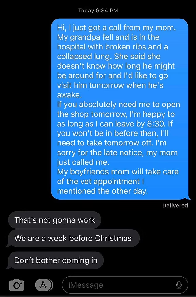 Her text read: “Hi, I just got a call from my mum. My grandpa fell and is in the hospital with broken ribs and a collapsed lung. She said she doesn’t know how long he might be around for and I’d like to go visit him tomorrow when he’s awake.