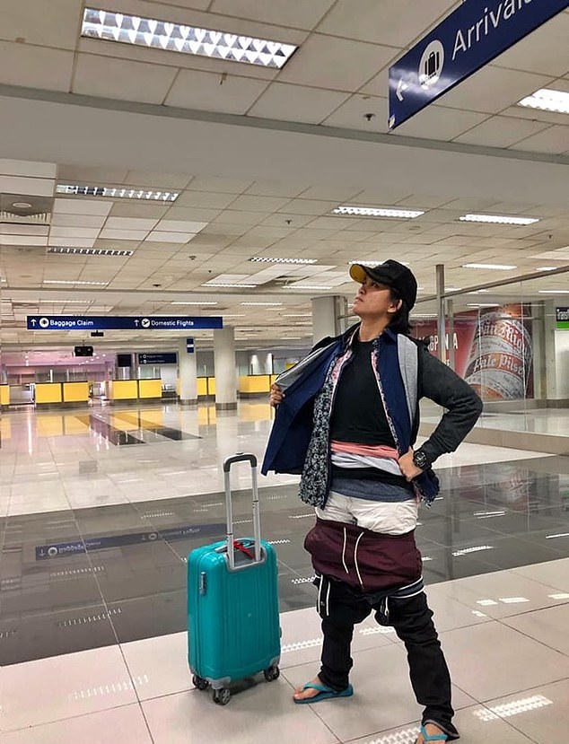 “When the airline staff at the check in counter said ‘Only seven kilos is allowed in hand luggage.’ Me: ‘No problem,’” Gel proudly wrote as she shared a photo showing her wearing dozens of pieces of clothing on the internet.
