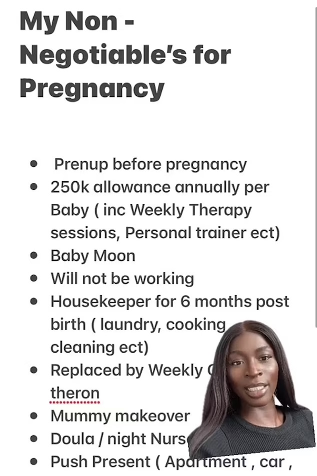 Surprisingly, Jenny’s list of demands doesn’t end there. The 23-year-old would also like the father of her potential child to hire a support companion as well as a housekeeper who would be replaced by a cleaner six months postpartum.