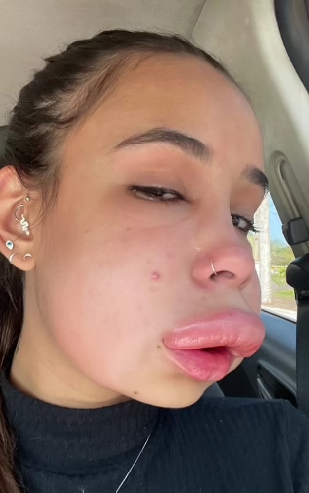 A young woman went viral on TikTok after revealing her giant lips and claiming they were a result of an allergic reaction.