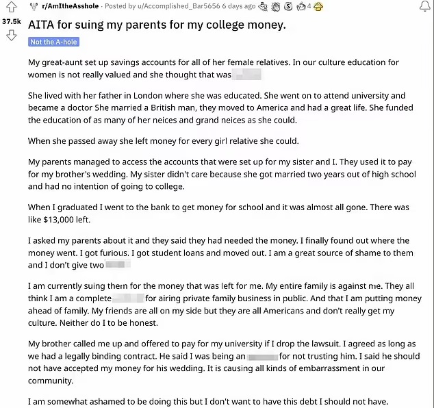 The poster went on to claim that her parents stole almost all of the money from her and her sister’s college fund to pay for their brother’s wedding among other things.