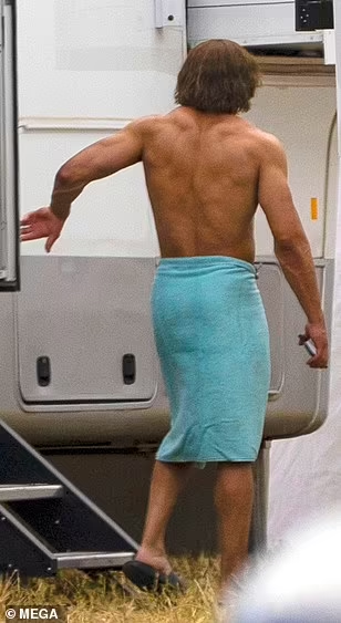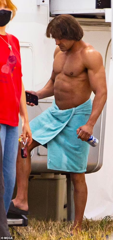 The 35-year-old actor looked so much different from his character Troy Bolton in The High School Musical franchise as he walked around the set wearing only a towel.
