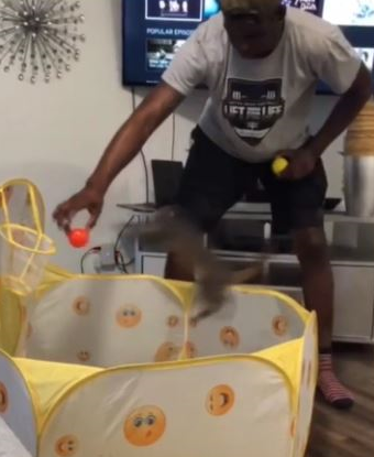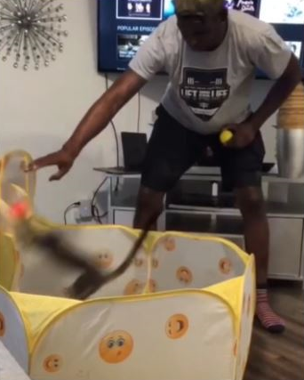 Biggies the owl monkey is probably the only monkey who can catch an alley-oop dunk that his owner gives.