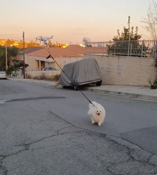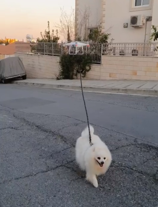 As seen in the video posted on Facebook and YouTube, Vakis Demetriou attached his dog’s tie to a remotely controlled drone before talking the pooch out for a walk.