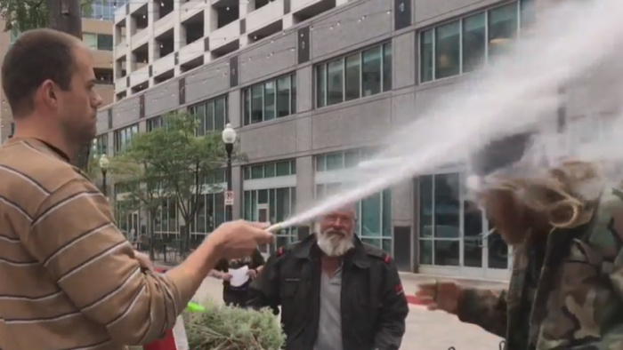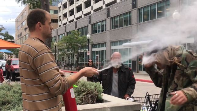 A woman recording the encounter asked Jamison: “Are you really going to spray him with that fire extinguisher?”