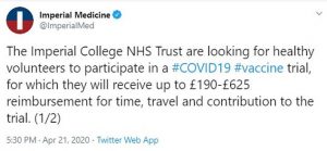 Imperial College London of Oxford University has officially announced it will be recruiting volunteers who would be willing to take part in a vaccine test, the first human coronavirus experiment in Britain and potentially make the first vaccine in the world.