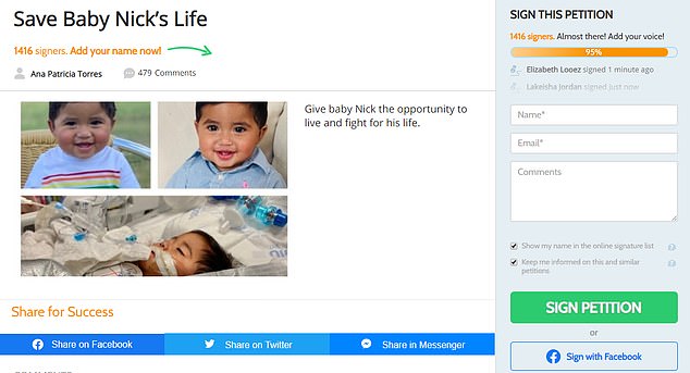 The parents believe that baby Nick still has a chance as his heart is still beating. They filed for an injunction against the hospital and sought over $1 million, claiming medics were ‘rushing to make a decision’ without giving their child the chance to fight.