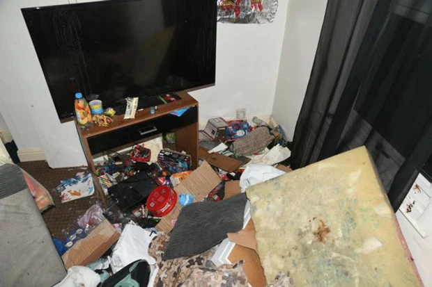 Unbelievable photos show cigarette butts around the disgusting rooms and rotting food in the kitchen. Officers even found feces on the walls and mold developing across the rooms.