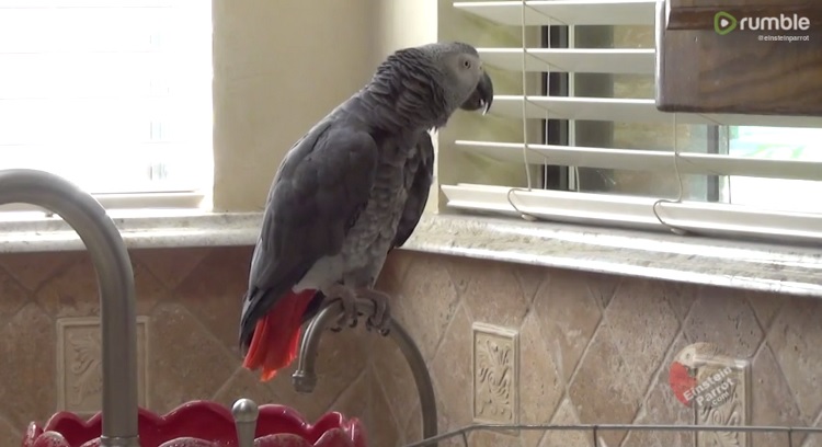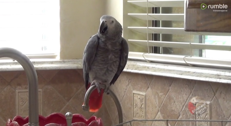 In this case, Einstein was on his favorite perch on the kitchen faucet when he espied a squirrel playing in the oak tree. Peering outside, he comments, looks at the squirrels, then tells them to turn around. He then states that he wants to go and see the animal! To top it all off, he even made that chirping or barking sound that squirrels make sometimes.