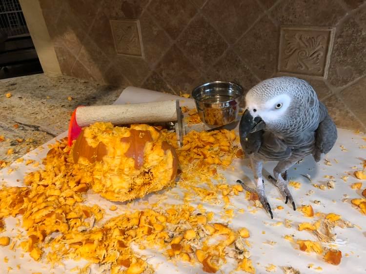 An adorable video shows Einstein – the Talking Texan Parrot – munching on pumpkins when he discovers pumpkin seeds.