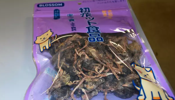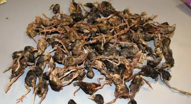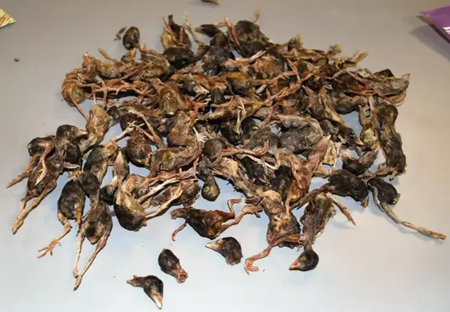 It had about thirty to thirty-five dried out birds that were already dead. Upon asking the passenger said that the birds were nothing but cat food.