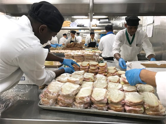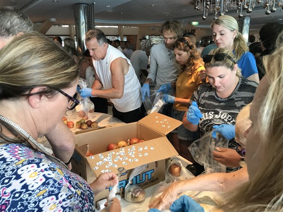 The ship’s kitchen staff prepared some 10,000 meals, while guests volunteered to plate and pack them. Even children helped with writing personalized cards to cheer up the victims pitched in, reports NBC News.