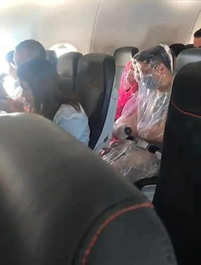 Two air travelers took virus cautionary measures to a whole new level by totally covering their bodies in plastic sheets as they boarded a flight.
