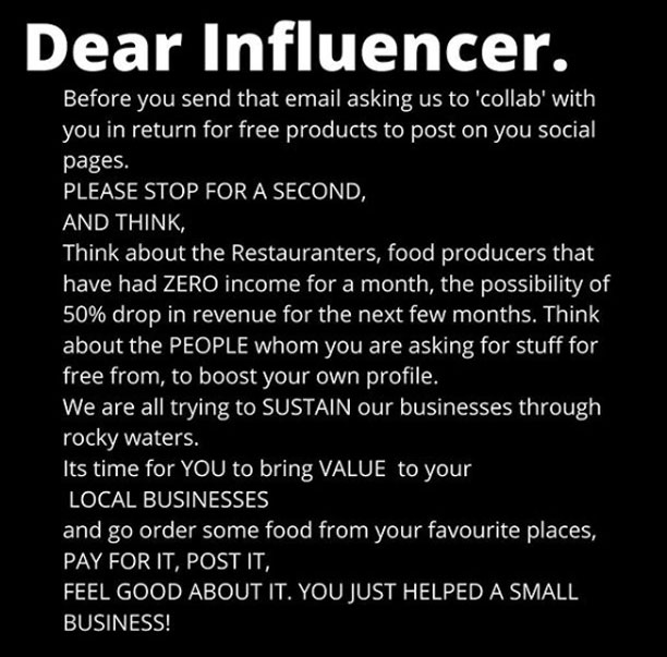 “PLEASE STOP FOR A SECOND AND THINK, Think about the Restauranters, food producers that have had ZERO income for a month, the possibility of 50% drop in revenue for the next few months. Think about the PEOPLE whom you are asking for stuff for free from, to boost your own profile.”