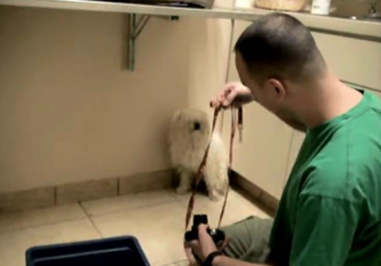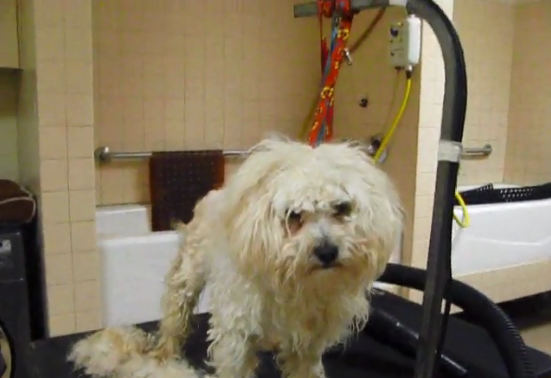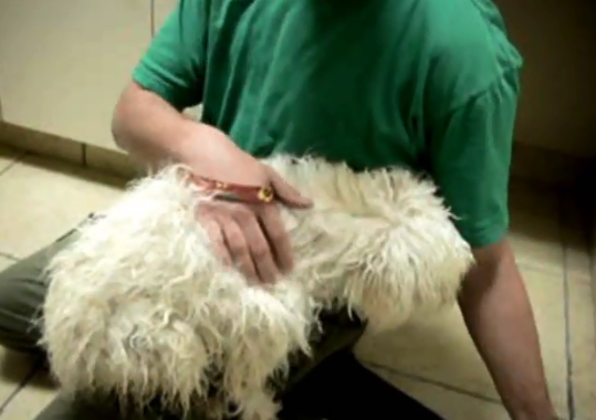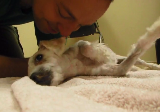 As soon as she climbed on his lap, the paranoid pup calmed down and let the human pat her and comfort her. Then she had a grooming session that got her rid of her dirty fur for a better chance at life.