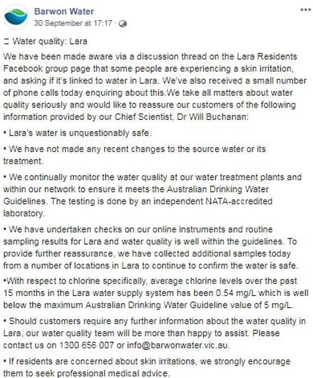 Barwon Water issued a statement on Facebook: “Lara’s water is unquestionably safe.”