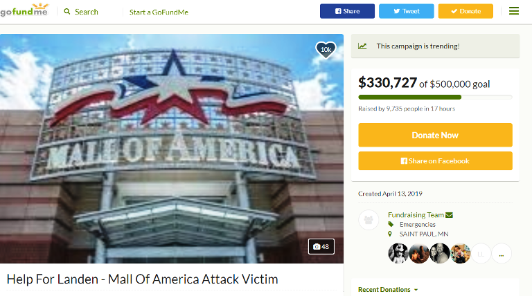 People have donated over $330,000 to the family of a child who suffered life-threatening injuries after a stranger threw him off a third-floor balcony in the Mall of America.