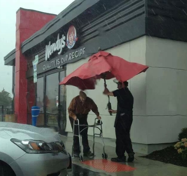 15 An elderly man was out in the rain and a Wendy’s employee grabbed an umbrella from a table to walk the gentleman to his car.