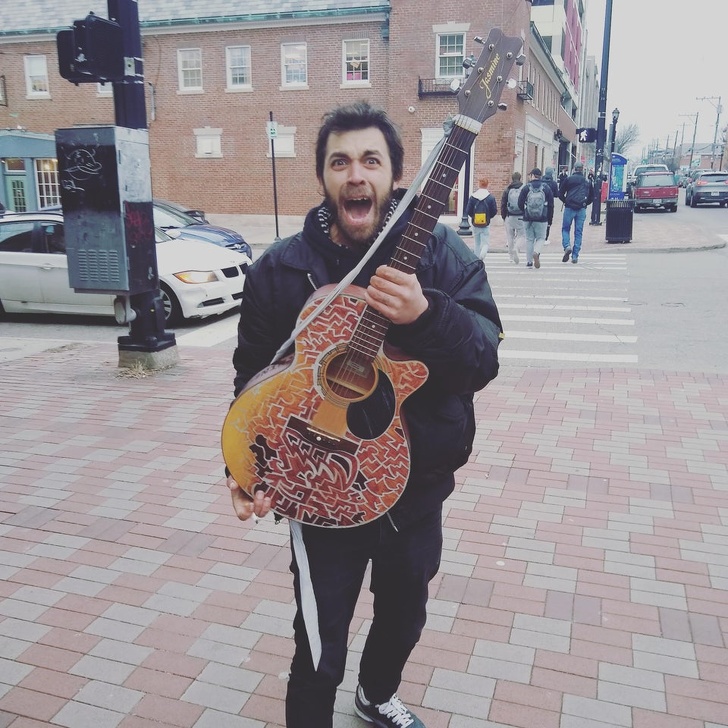 3 A guy gave his first guitar to this local homeless musician who was borrowing guitars to play for a living. The look on his face says it all.