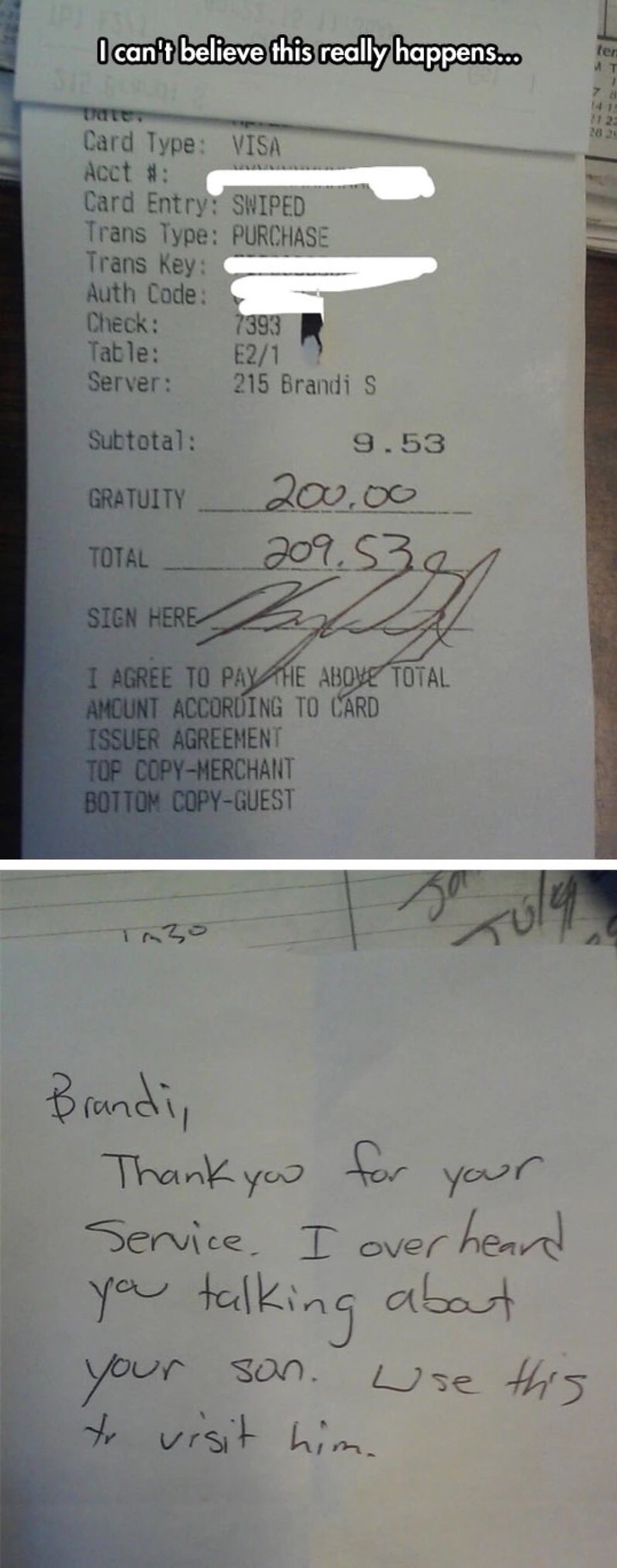 4 This customer tipped $200 to a server to help her visit her son. Faith in humanity restored.