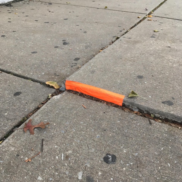 7 Someone placed a piece of orange tape on the side of the sidewalk that is a little raised to help people stop tripping over it.