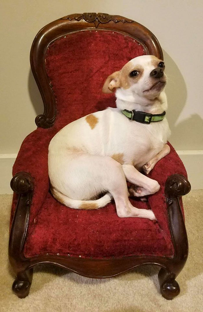9. ”Here’s My Boy Bax Looking Regal Af In His Tiny Chair That I Found At The Goodwill. Someone Serve This King Some Tea & Crumpets Already.”