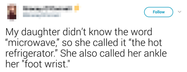 - An individual said that his/her daughter didn’t know how to say microwave for which she called it “the hot refrigerator”.