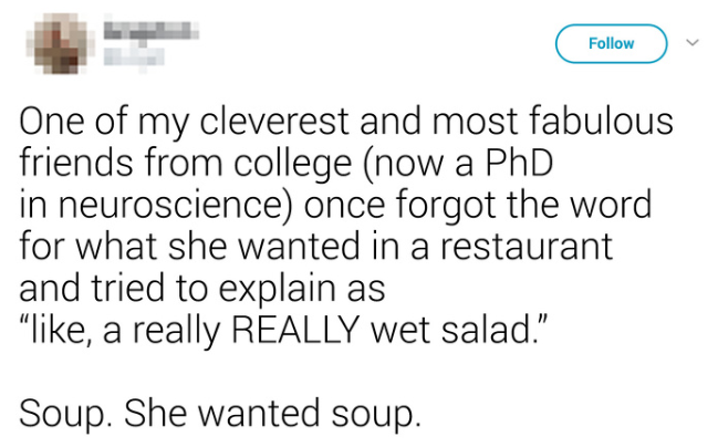 - An individual said that one of his cleverest friends forgot the word to say for soup and replaced it with a really wet salad.