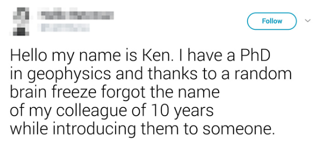 - A guy named Ken thanked his random brain freeze as he forgot the name of his colleague of 10 years while introducing him.