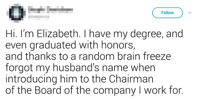 - A woman named Elizabeth forgot her husband’s name when introducing him to the Broad of Chairman of the company due to brain freeze.