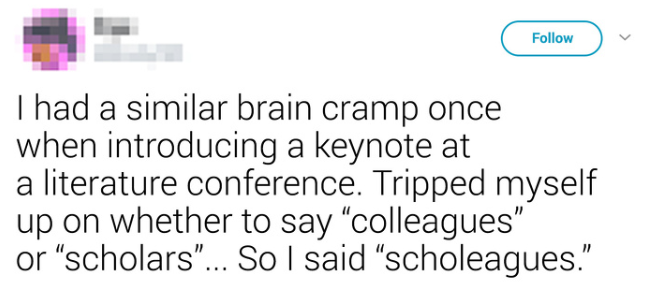 - A person faced a brain freeze when introducing a keynote during a conference held for literature. The person was confused about whether to use “colleagues” or “scholars” instead used “scholeagues”