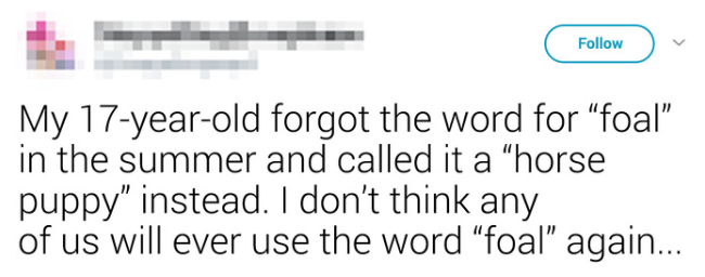 - A 17-year-old forgot the word of foal during the summers and called it a “horse-puppy” as a replacement.