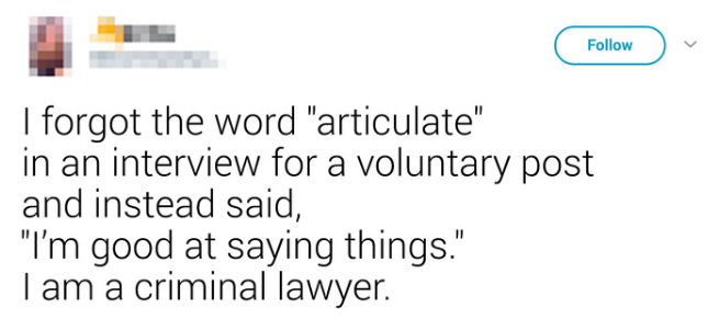 - An individual forgot the word “articulate” during an interview for the voluntary post and said, “I am good at saying things”.