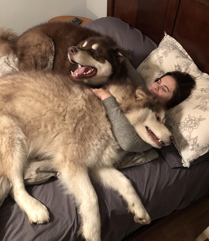 #19. This pupper is about twice as big as his owner. So, which of the 2 has more claim to the bed?