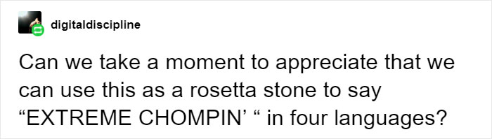 “My favorite thing about the ‘Jurassic Park’ movies, hands down, is the part at the end of the first movie where the raptors have the kids cornered in the atrium and suddenly the T-Rex busts in out of literally nowhere, only to start flinging raptors around like ragdolls and pose dramatically behind the falling ‘WHEN DINOSAURS RULED THE EARTH’ sign. (Oh, and she saved those kids too, I guess).