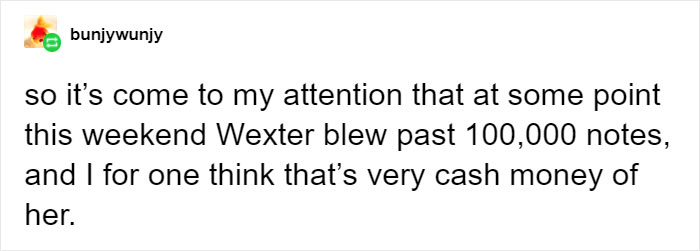 As of now, Bunjywunjy’s thread on Tumblr where they share Wexter’s activities has got reactions from 250,000 users, supporting them in having fun with their childhood crush.