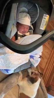 Recently, a dog kept rocking the baby chair to make the crying baby go back to sleep.