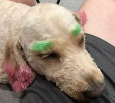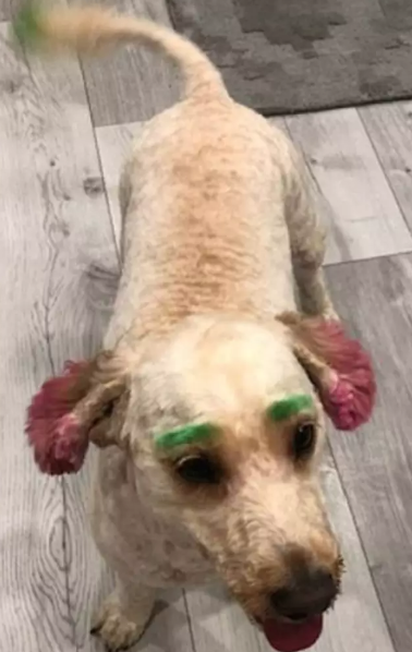 She took her Goldendoodle, Lola, to the grooming center for a nail trim, buzz cut, and getting its teeth clean. However, the groomer decided it would be fun to dye the dog’s fur and chose neon pink and neon green.